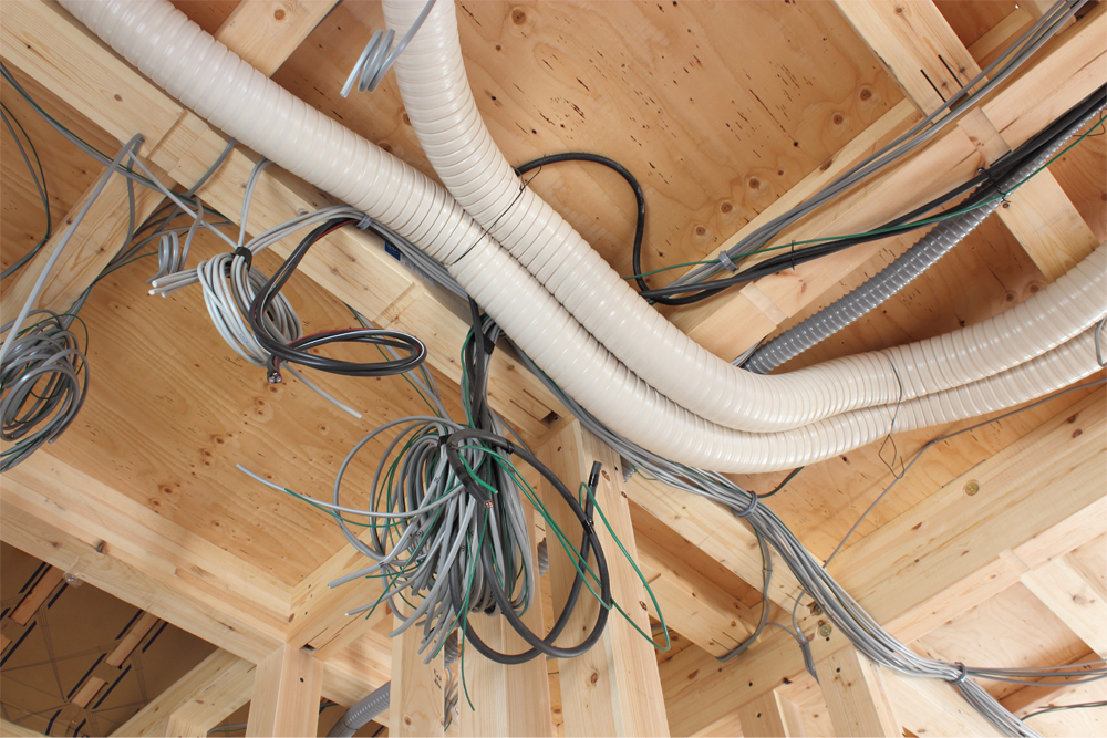 私たちが取り扱う屋内配線は多種多様です。テレビのアンテナケーブル、VVFケーブル、LANケーブル、電話線、照明器具、スイッチ、コンセント、インターホンなど、一つひとつの電気設備ごとに配線が要求されます。これらの配線を、図面をしっかりと確認しながら正確な位置に配置します。それぞれの現場で図面が異なるため、見落としのないように丁寧な確認を行ないつつ作業を進めていきます。また、私たちは屋外での電気工事も得意としています。電柱からの引き込み工事などもお気軽にご依頼ください。高所作業から地下にケーブルを埋める作業まで、幅広い作業を一貫して承っております。私たちの豊かな技術力と柔軟な対応力を活かし、お客さまの多様なご要望に対応いたします。